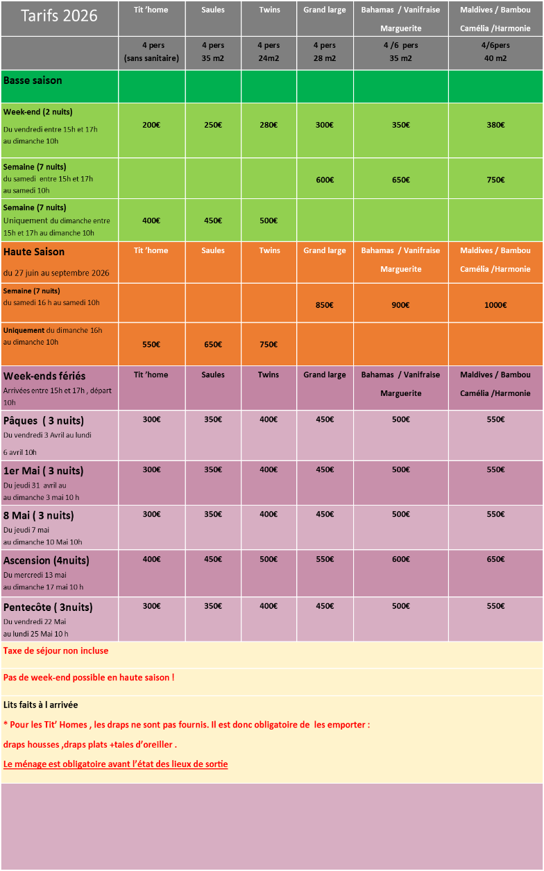 Tarifs des locations